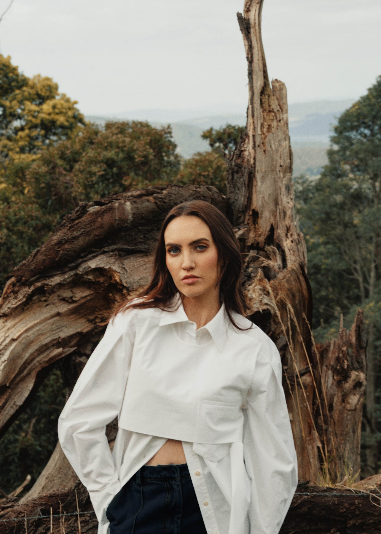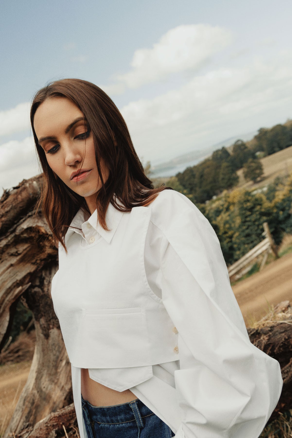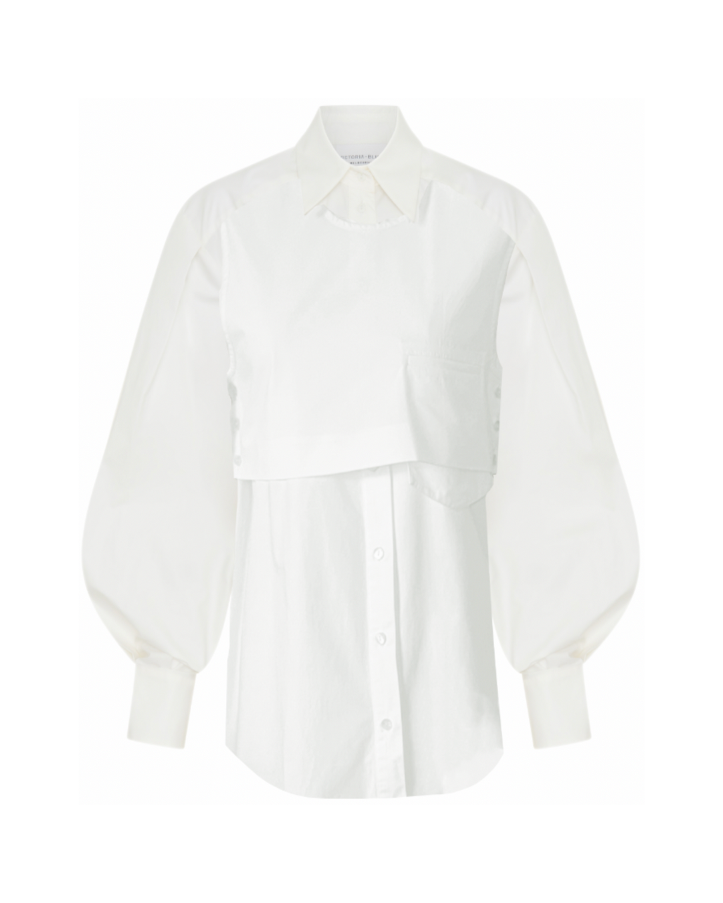 Crisp, heavy, cotton shirting - the She is Bold layered shirt explores deconstruction of a classic wardrobe archetype with a detachable buttoned overlay piece featuring a welt pocket. Blouson sleeve with narrow cuff and relaxed fit throughout the body lends itself to multiple styling options. Style back with the She is Brave wool tie corset, denim jean or wool suiting.