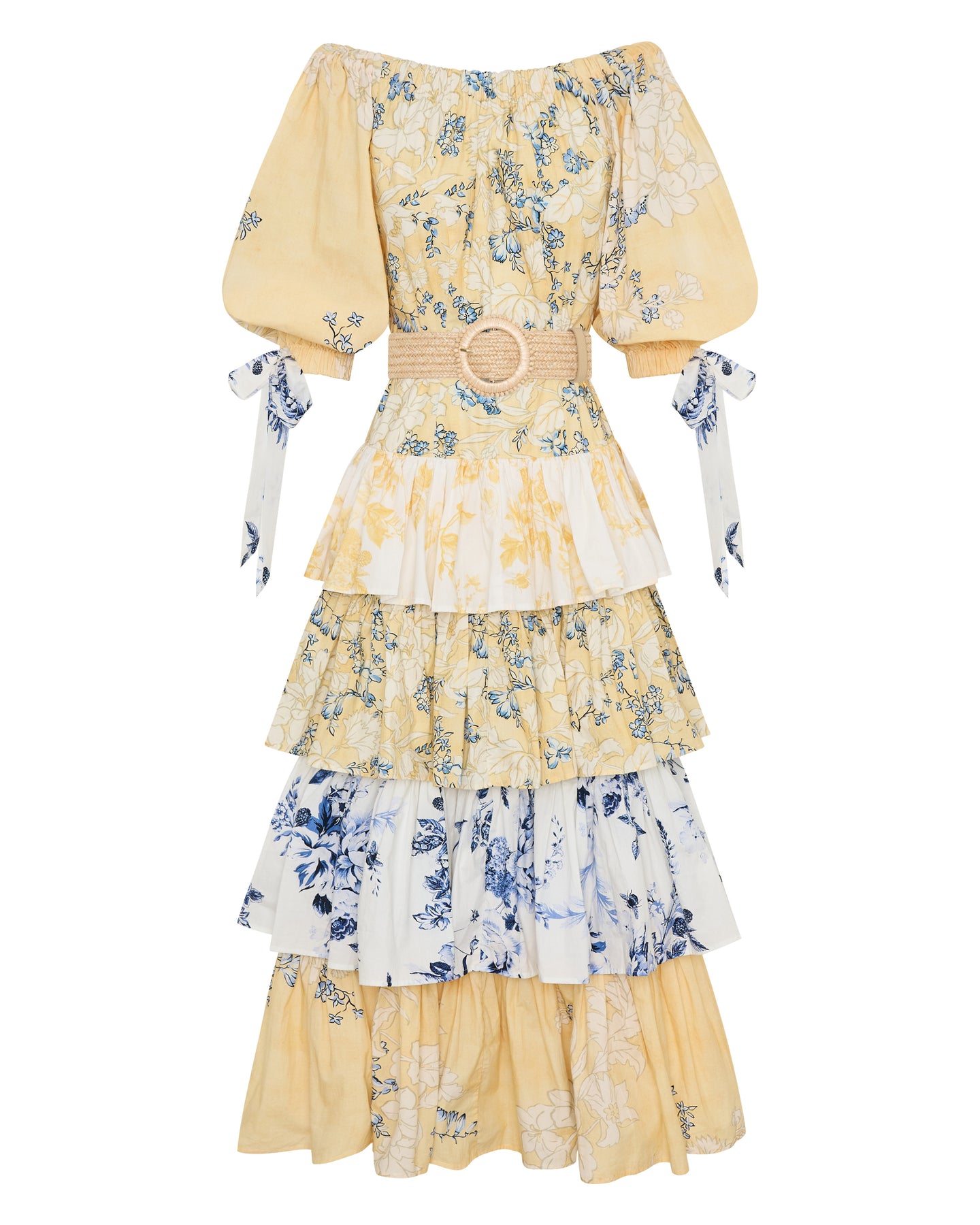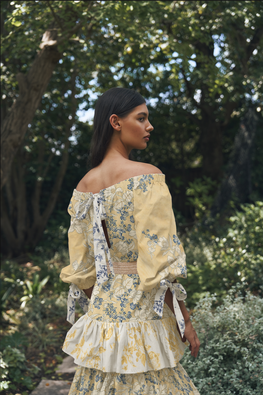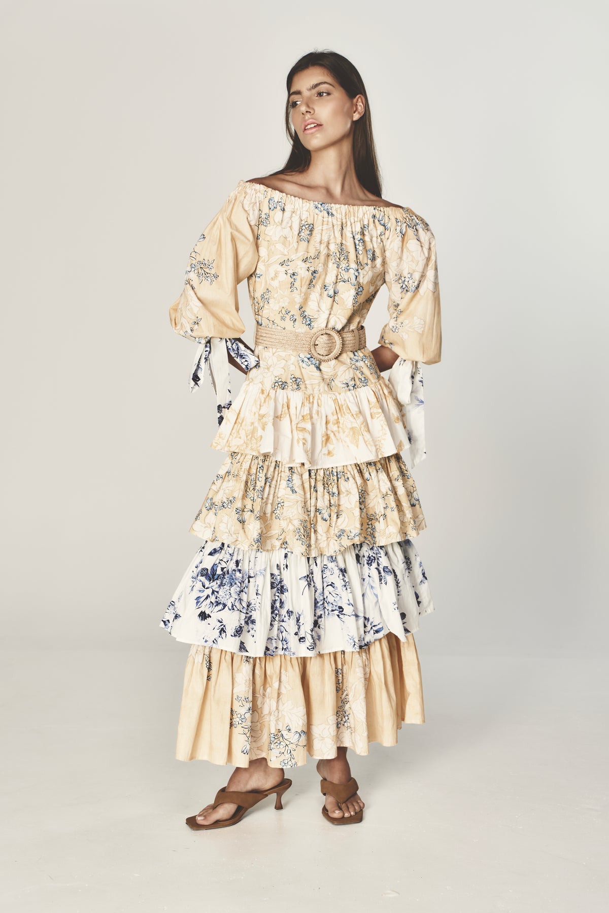 The She is Eminent cotton tiered dress features a selection of this season's custom prints, thoughtfully spliced together. Full blouson sleeves with elasticated cuffs and neckline for wearer versatility - wear as a boat neck or off-the-shoulder. Featuring a tie back, invisible zip with a subtle off the body fit through the bodice and detachable raffia belt for a cinched waist option. Style back with the She is Eminent corset for even more of a statement.