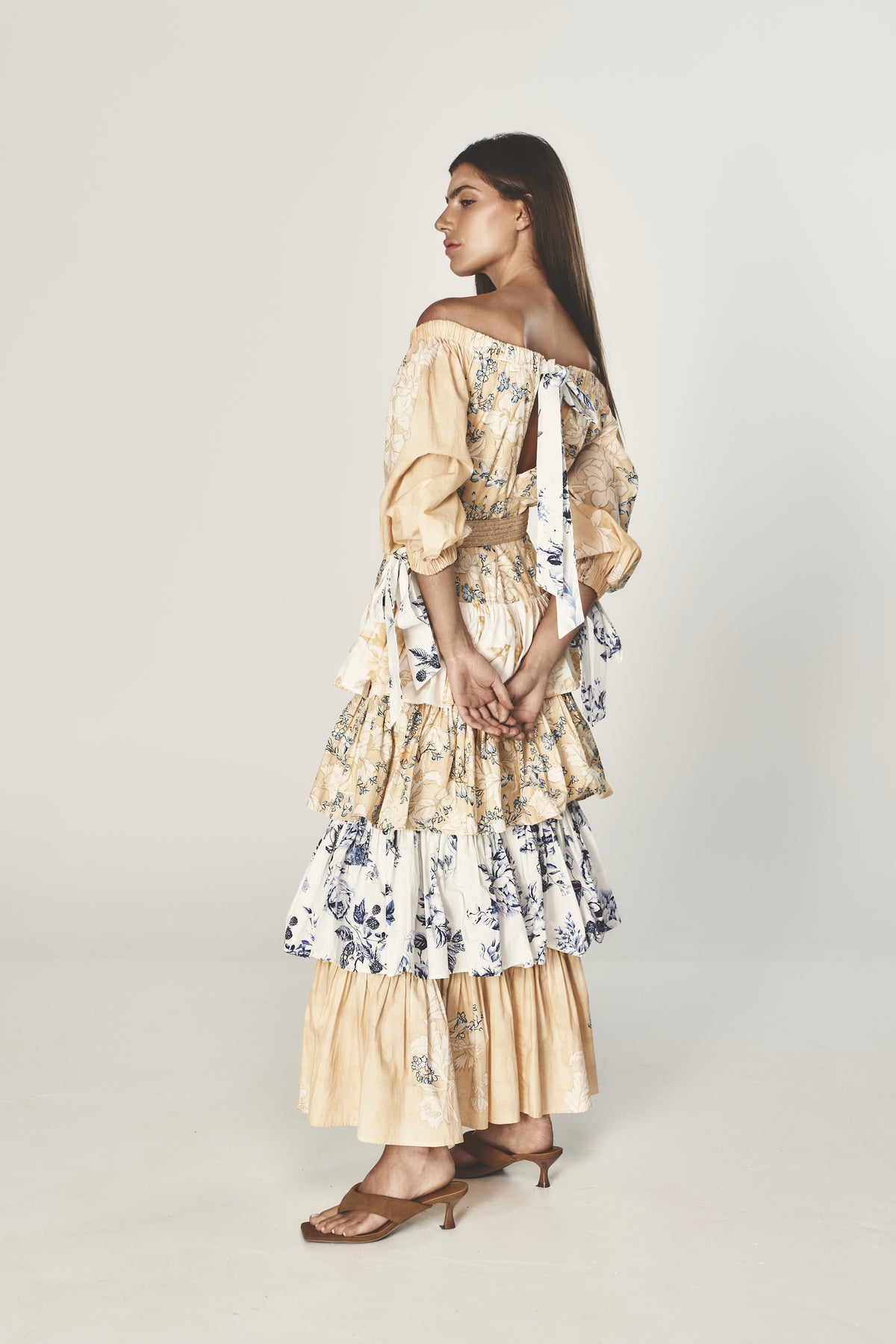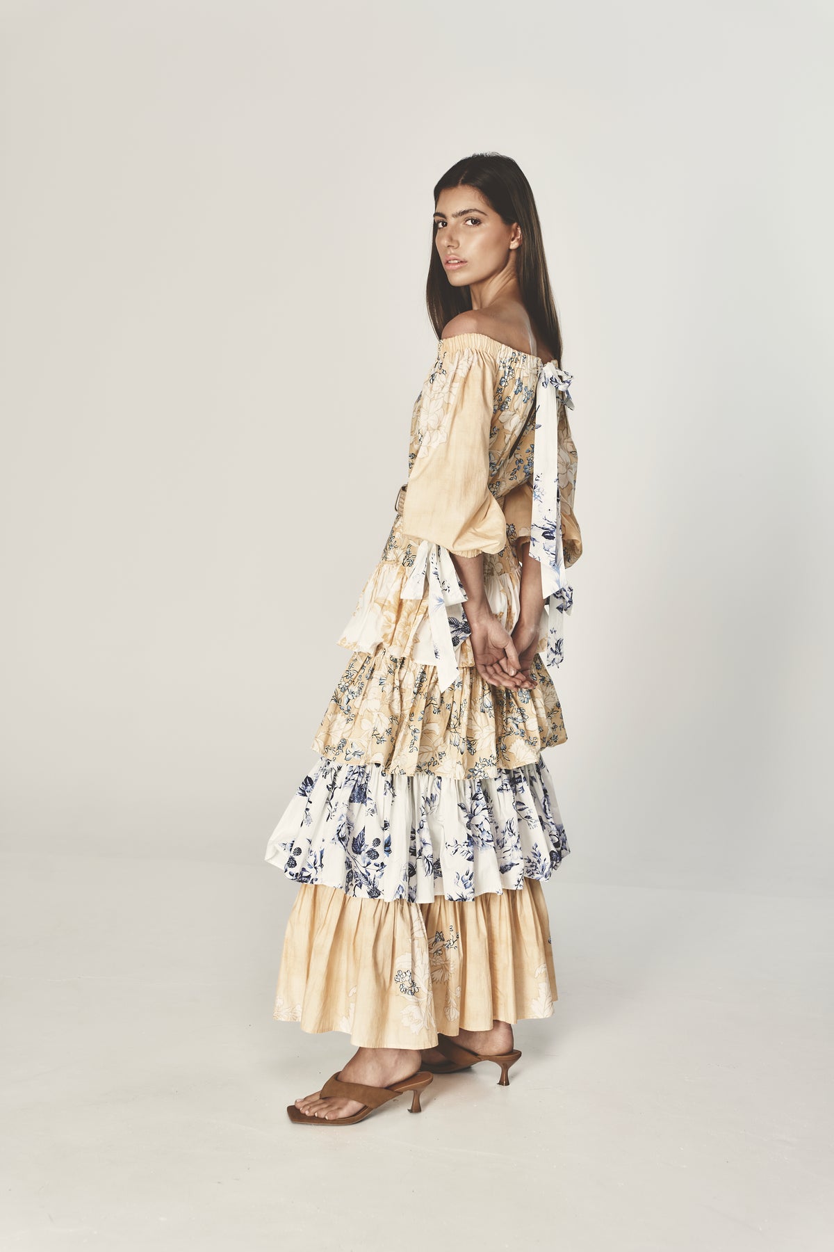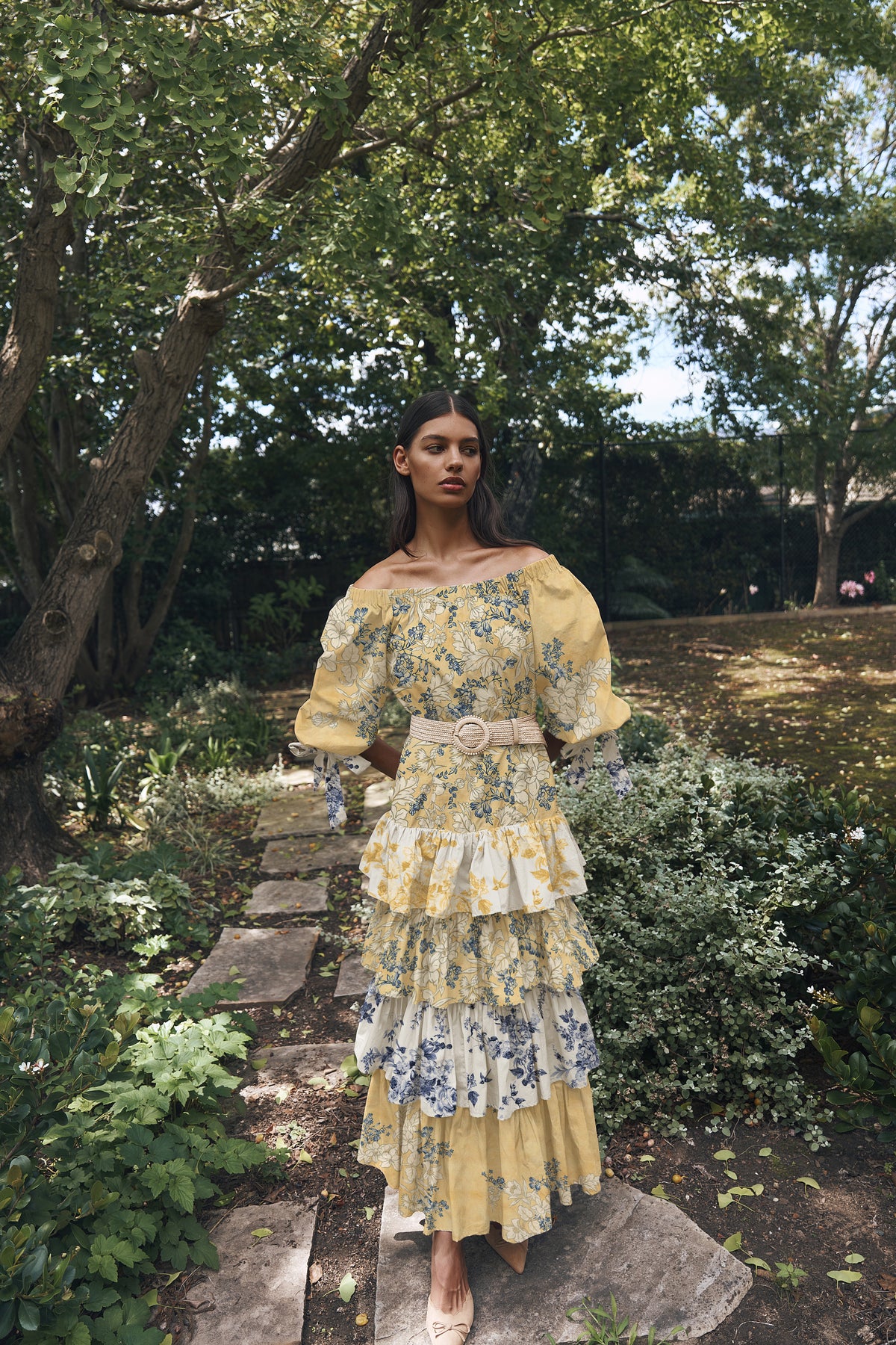 The She is Eminent cotton tiered dress features a selection of this season's custom prints, thoughtfully spliced together. Full blouson sleeves with elasticated cuffs and neckline for wearer versatility - wear as a boat neck or off-the-shoulder. Featuring a tie back, invisible zip with a subtle off the body fit through the bodice and detachable raffia belt for a cinched waist option. Style back with the She is Eminent corset for even more of a statement.