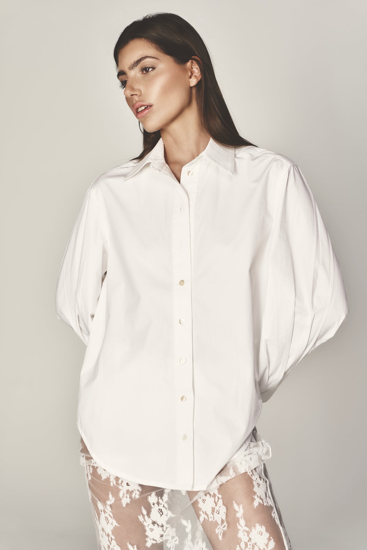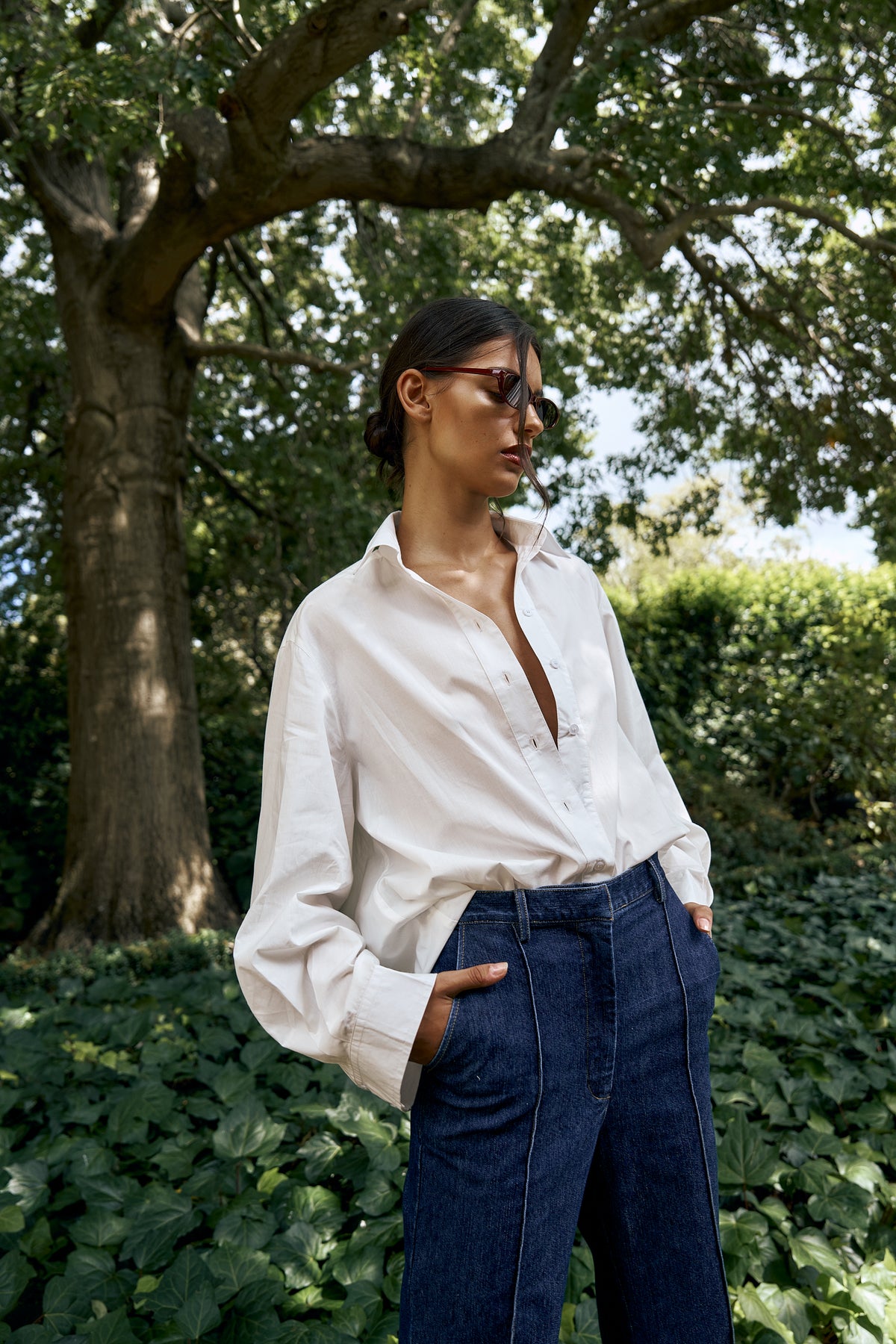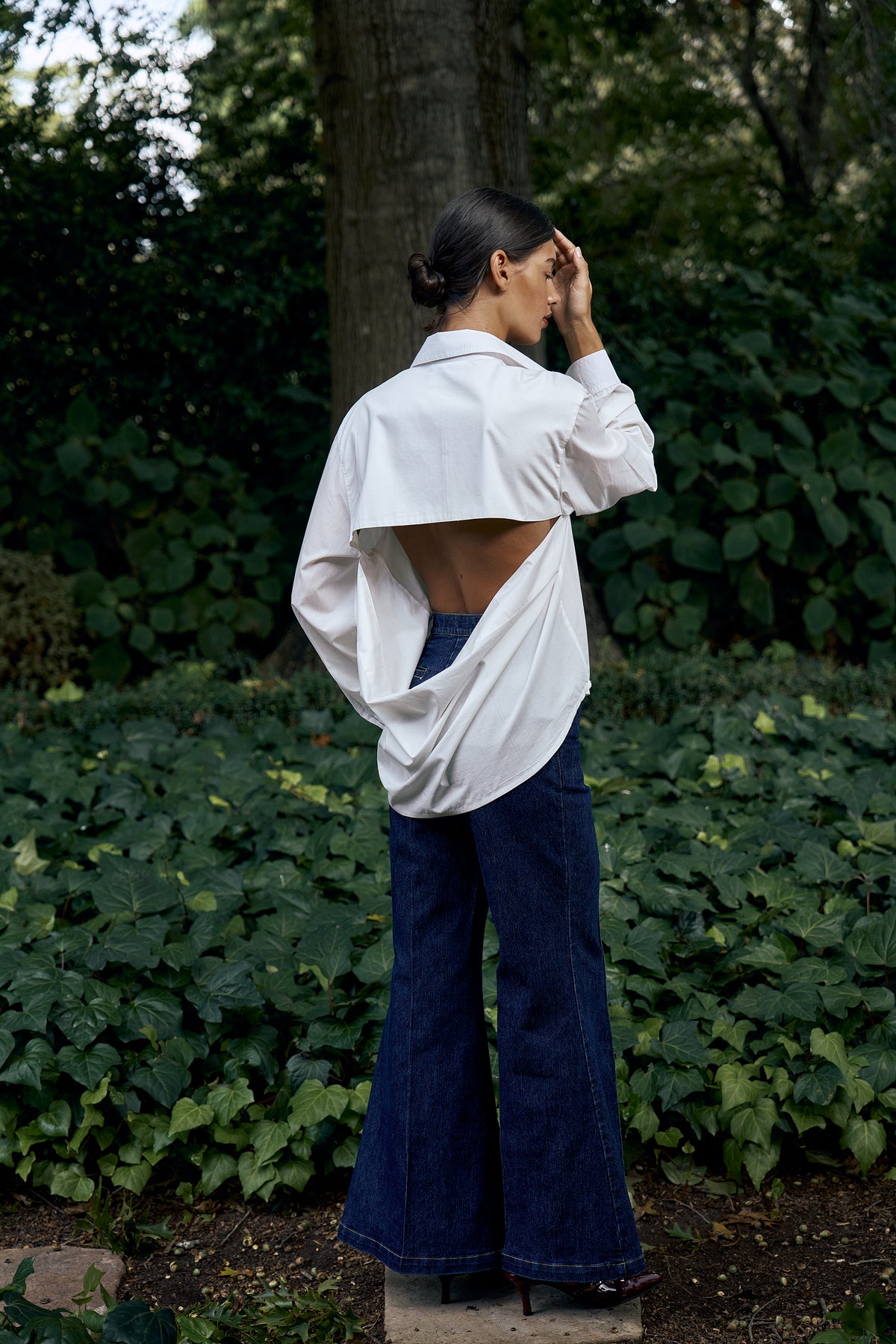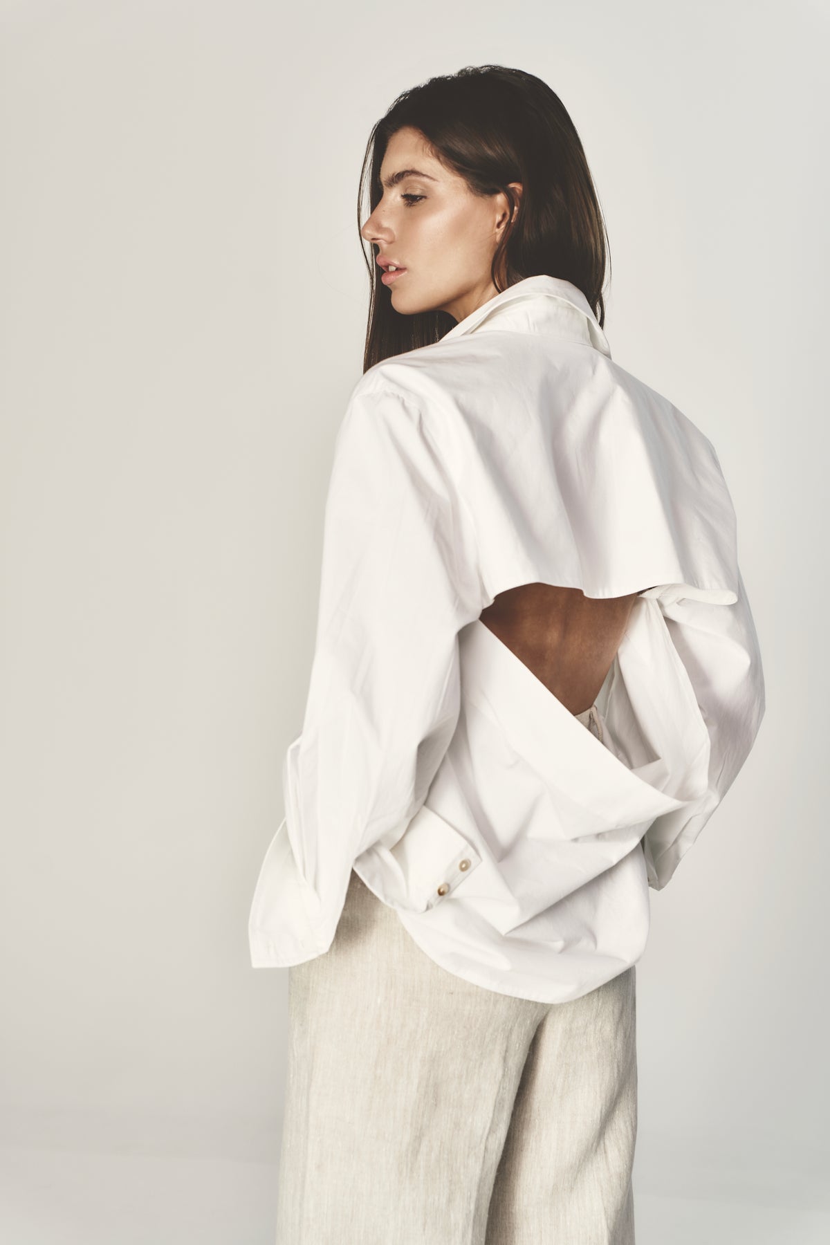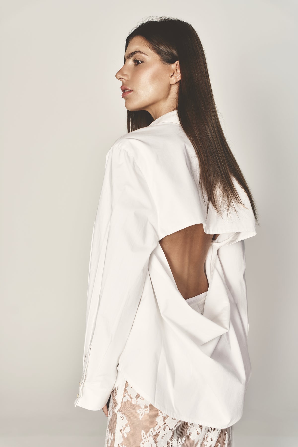 Crisp, heavy, cotton shirting - the She is Bold open back shirt revamps a classic wardrobe icon with an open back drape. Effortlessly cool, this piece is a must have summer staple. Oversized, relaxed fit that lends itself to multiple styling options. Bra friendly with deep back yoke and open draped cowl. Style back with the She is Bold lace skirt, denim jean or linen suiting.