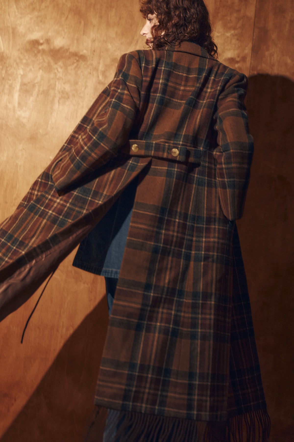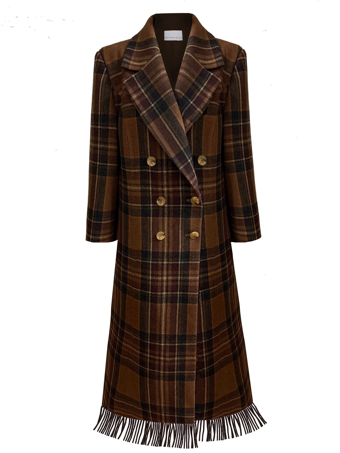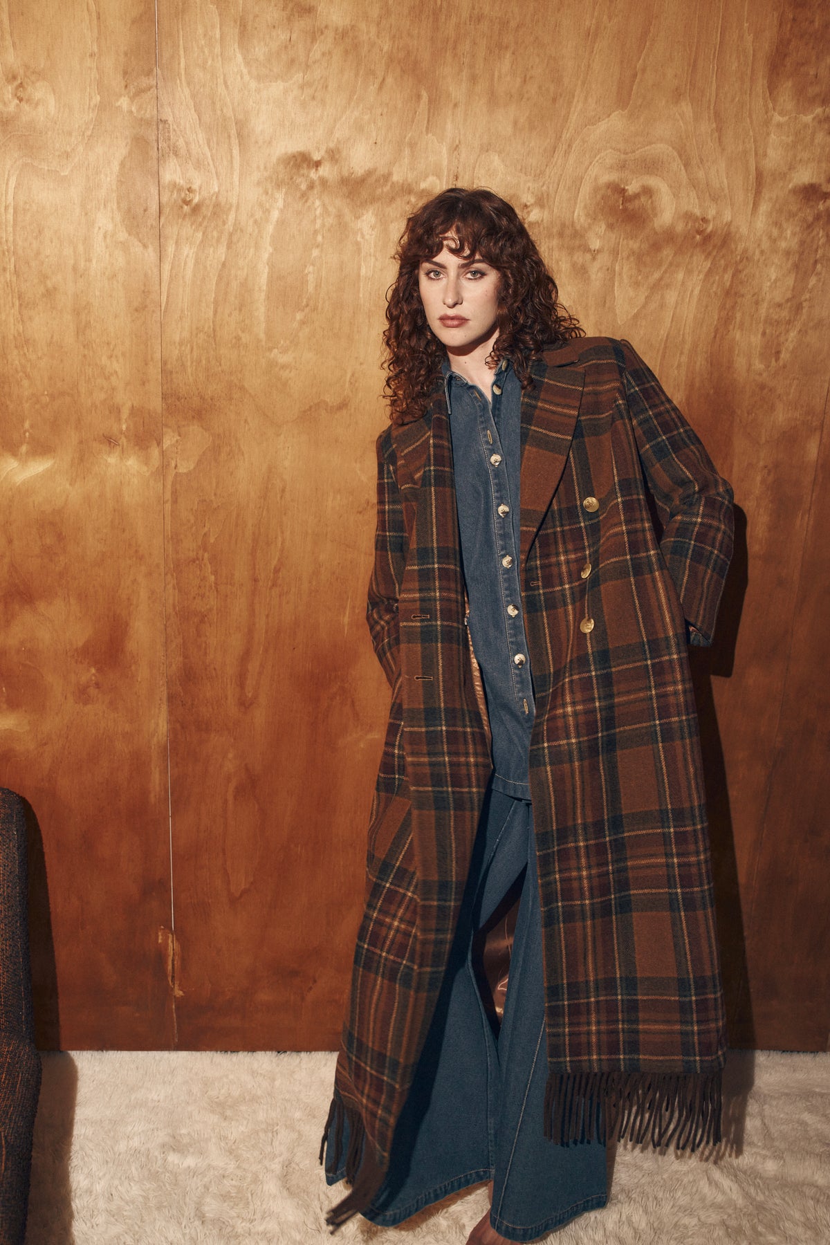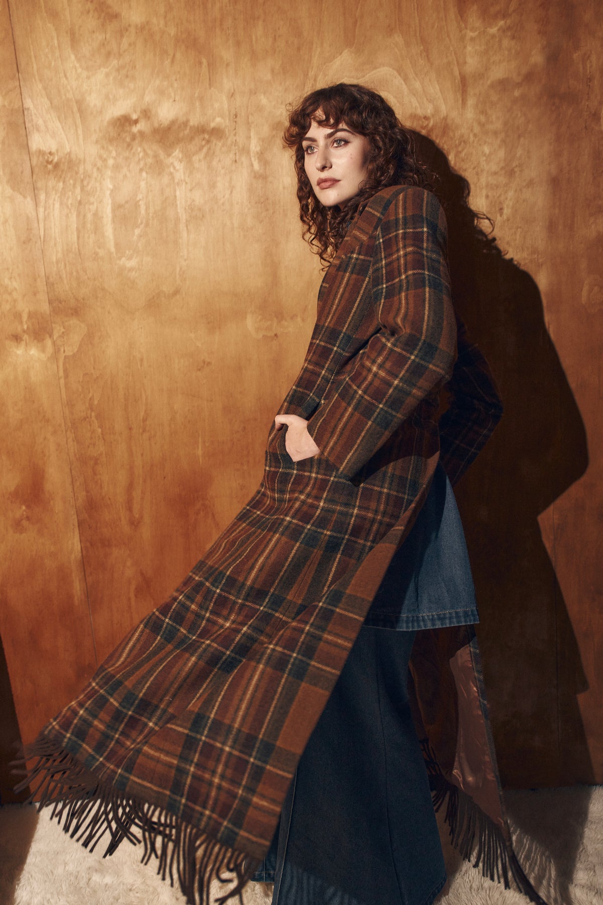 The She is Brave wool coat features our limited-edition wool tartan with fringe hem for a thoughtful exploration of the classic tartan blanket. Wrap yourself in warmth this winter with this season's statement coat. Double breasted, oversized fit through the shoulders with a deep back vent. Wear back with denim casually or dress it up with the She is Brave shift dress.