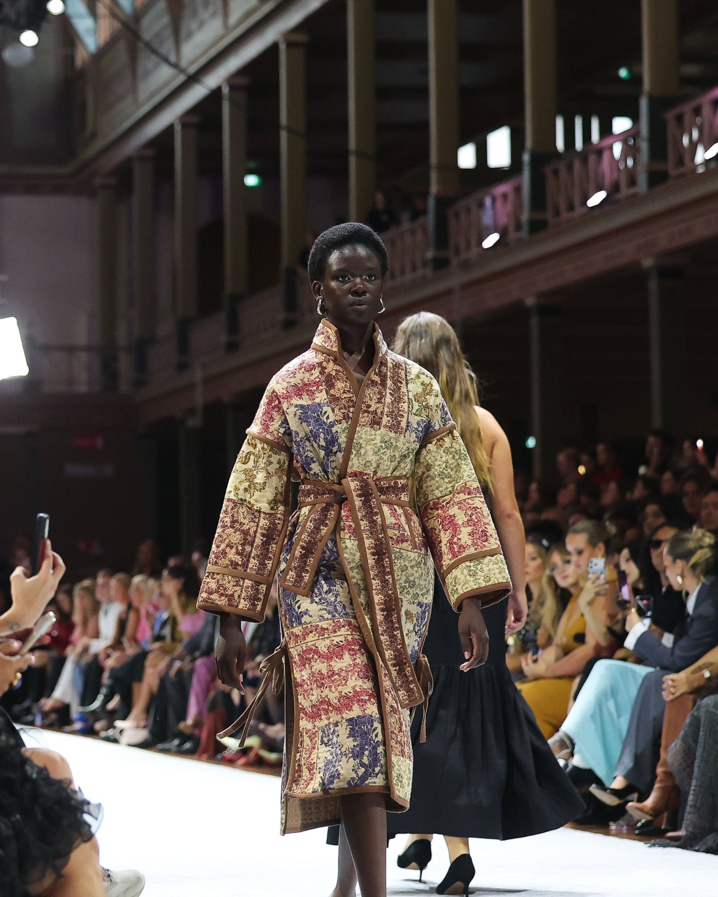The She is Intricate wool quilted coat, celebrates this season's in-house prints. A statement winter piece inspired by historical Jacobean florals thoughtfully patchworked together and quilted with a contrast border print tie. Open sides for breathability and versatility, along with a self-tie belt for a cinched waist option.